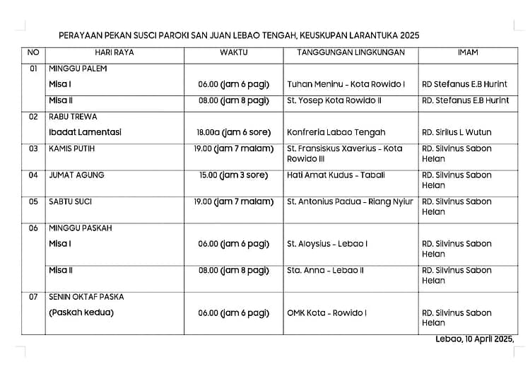 Jadwal Perayaan Misa Pekan Suci Paroki San Juan Lebao Tengah, Keuskupan Larantuka 2025 Categories: Pengumuman